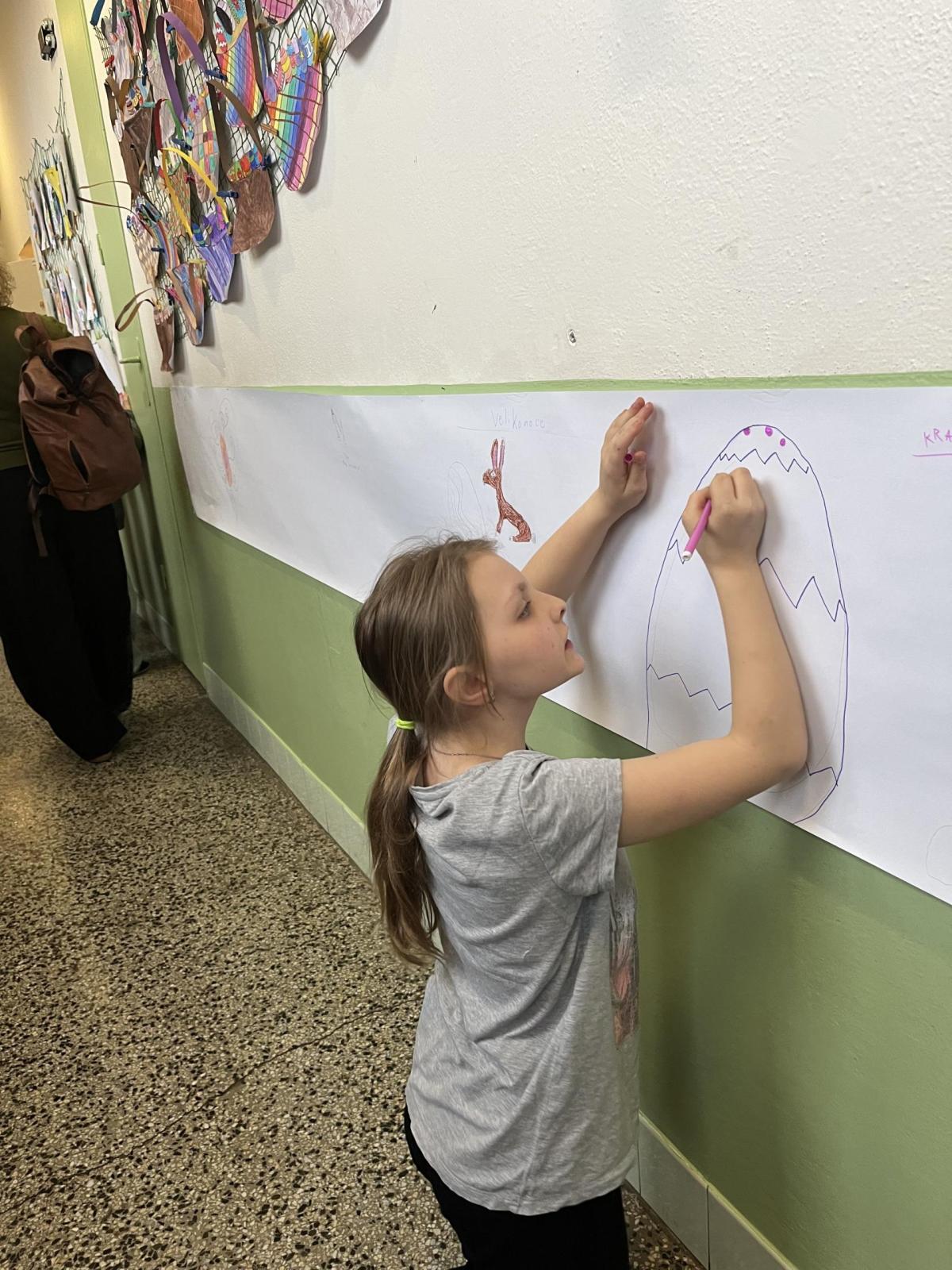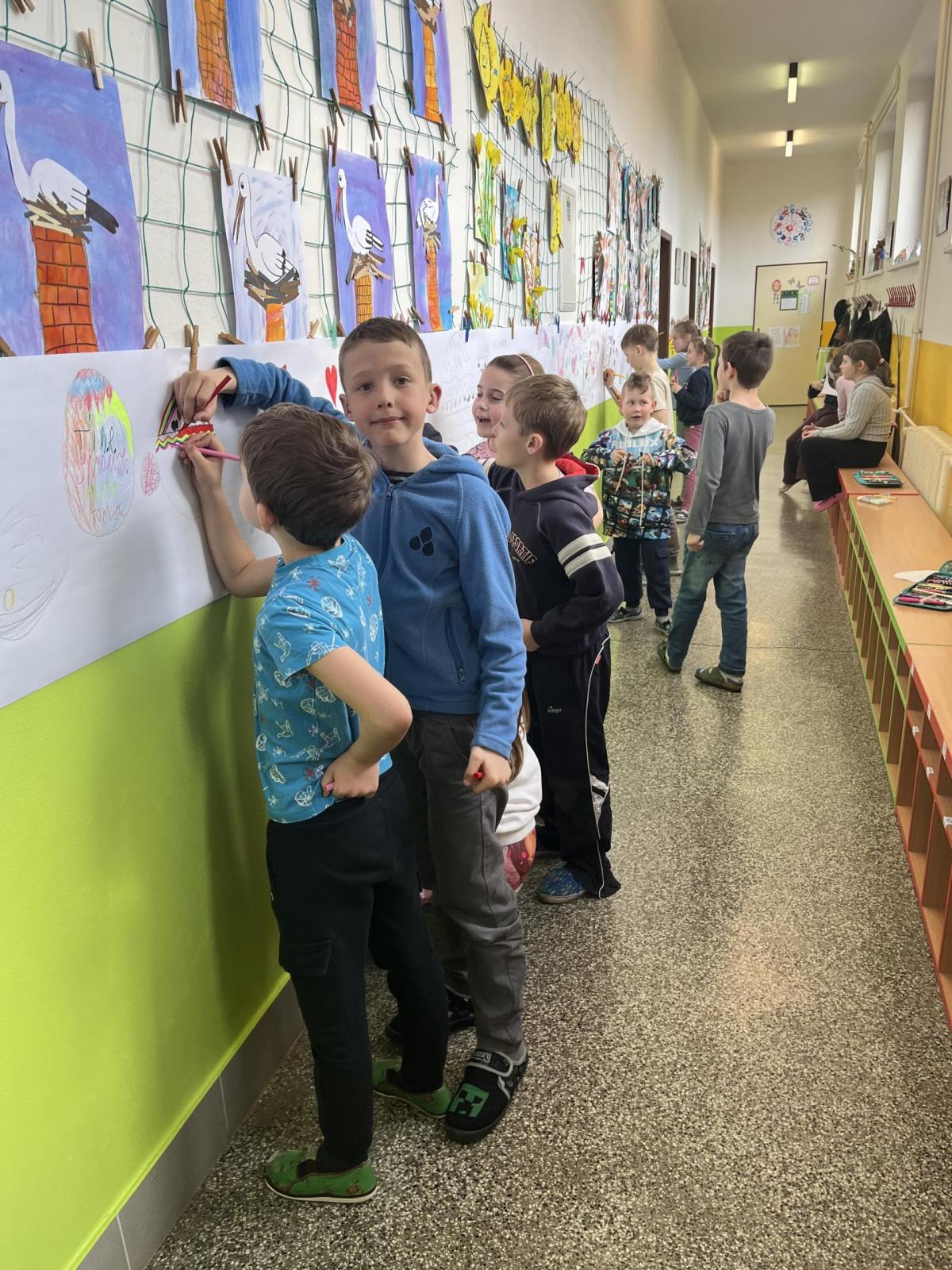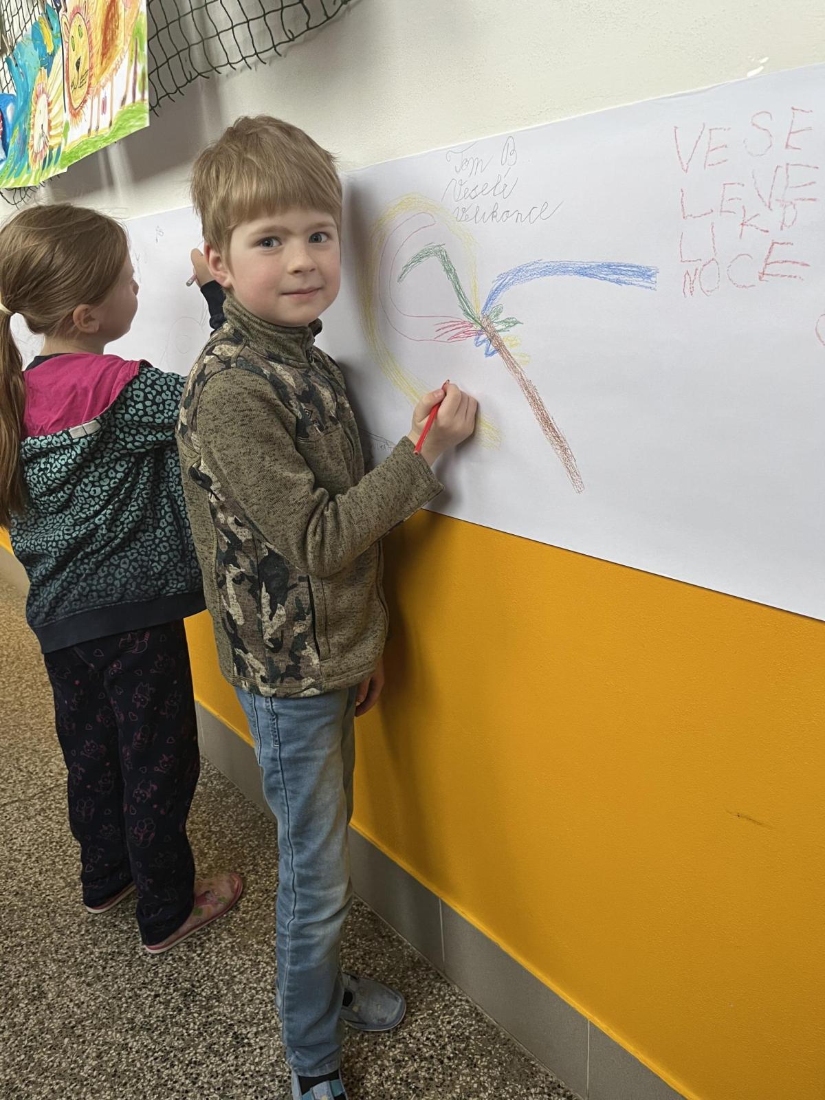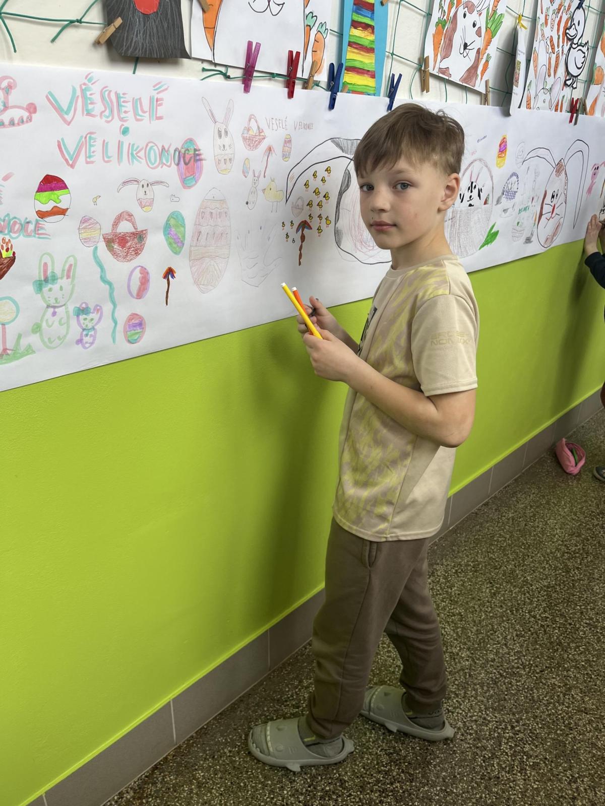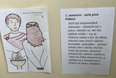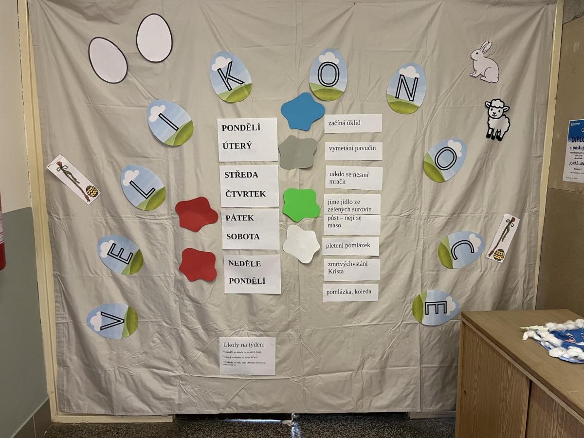 Celý svatý týden byl u nás ve škole protkán aktivitami s velikonoční tématikou. Hlavním cílem bylo nabídnout dětem rozmanité činnosti, kterými si mohou obohatit přestávky a dozvědět se něco nového. Na Modré pondělí jsme se oblékli do modrého a na zahradě za pavilonem řešili běhací kvíz, který ověřil naše znalosti o těchto svátcích. V úterý se celý pavilon dal do malování na balicí papír. A středu jsme si raději pojistili krásnými smajlíky, abychom se nemračili celý rok. Během celého týdne si mohly děti projít křížovou cestu a vyplnit pracovní listy, které byly uzpůsobené jejich věku. Pro děti byla také připravena běhací tajenka v anglickém jazyce, při které si děti zopakovaly, jak se slaví Velikonoce v jiných zemích.